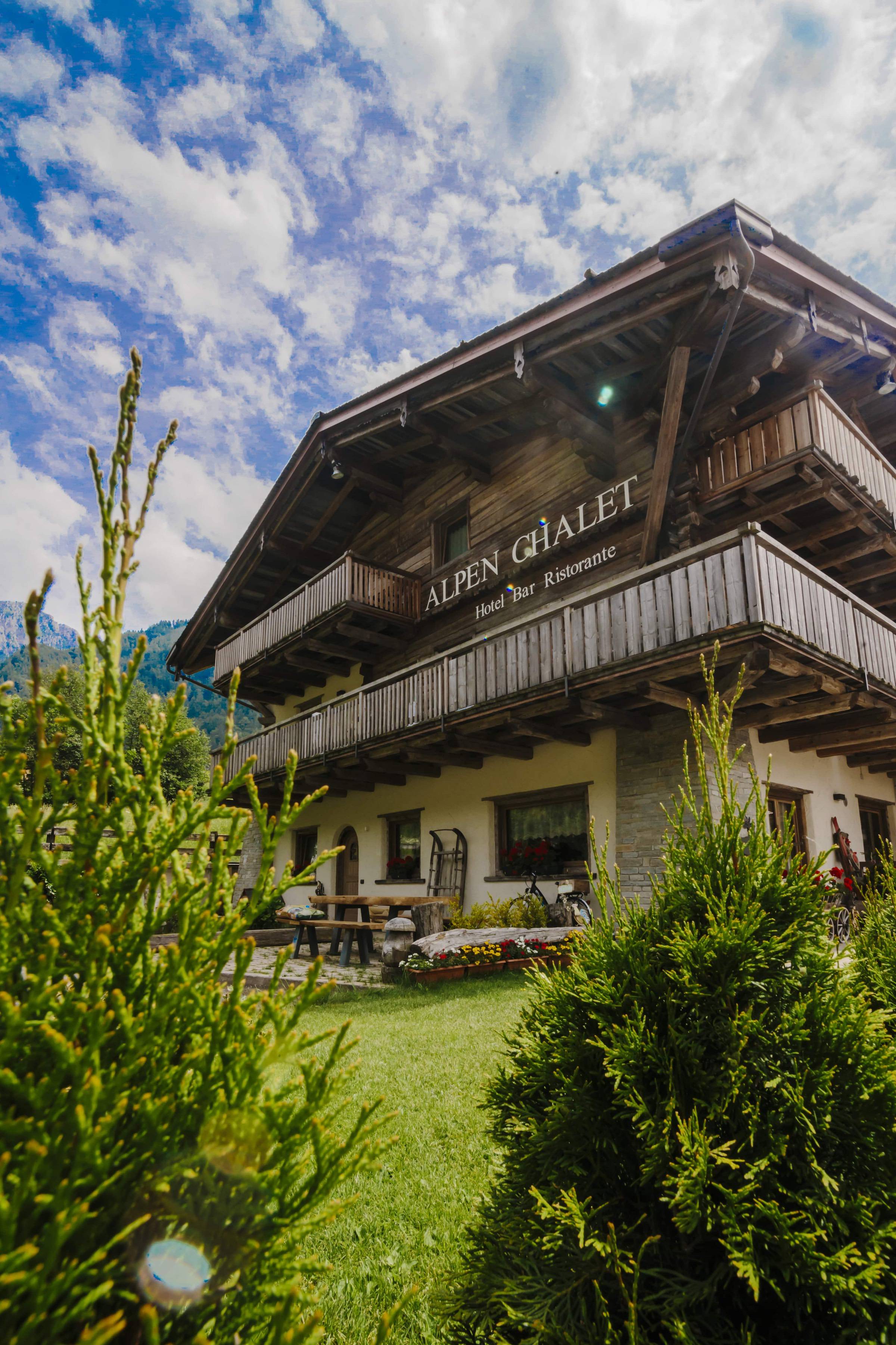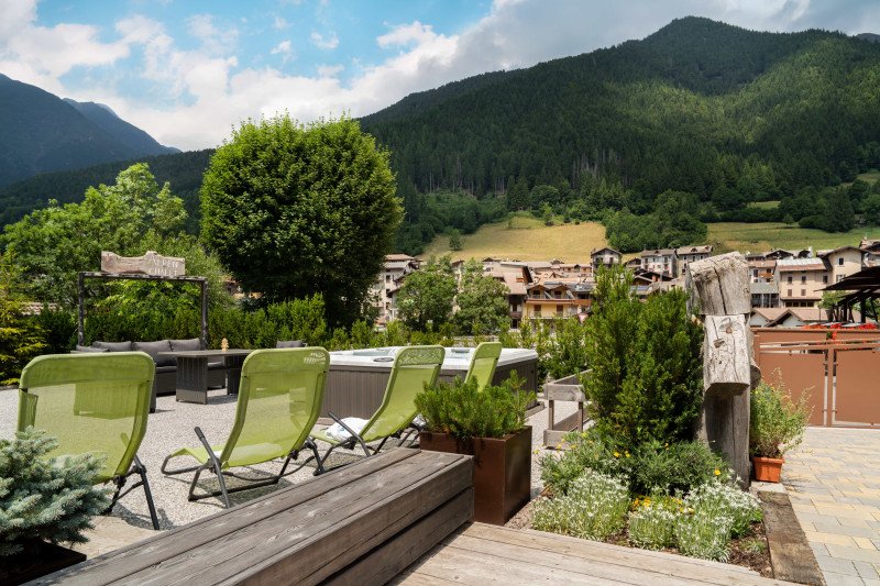 Camere in legno, luminose, con ampi balconi affacciati sul paesaggio alpino.