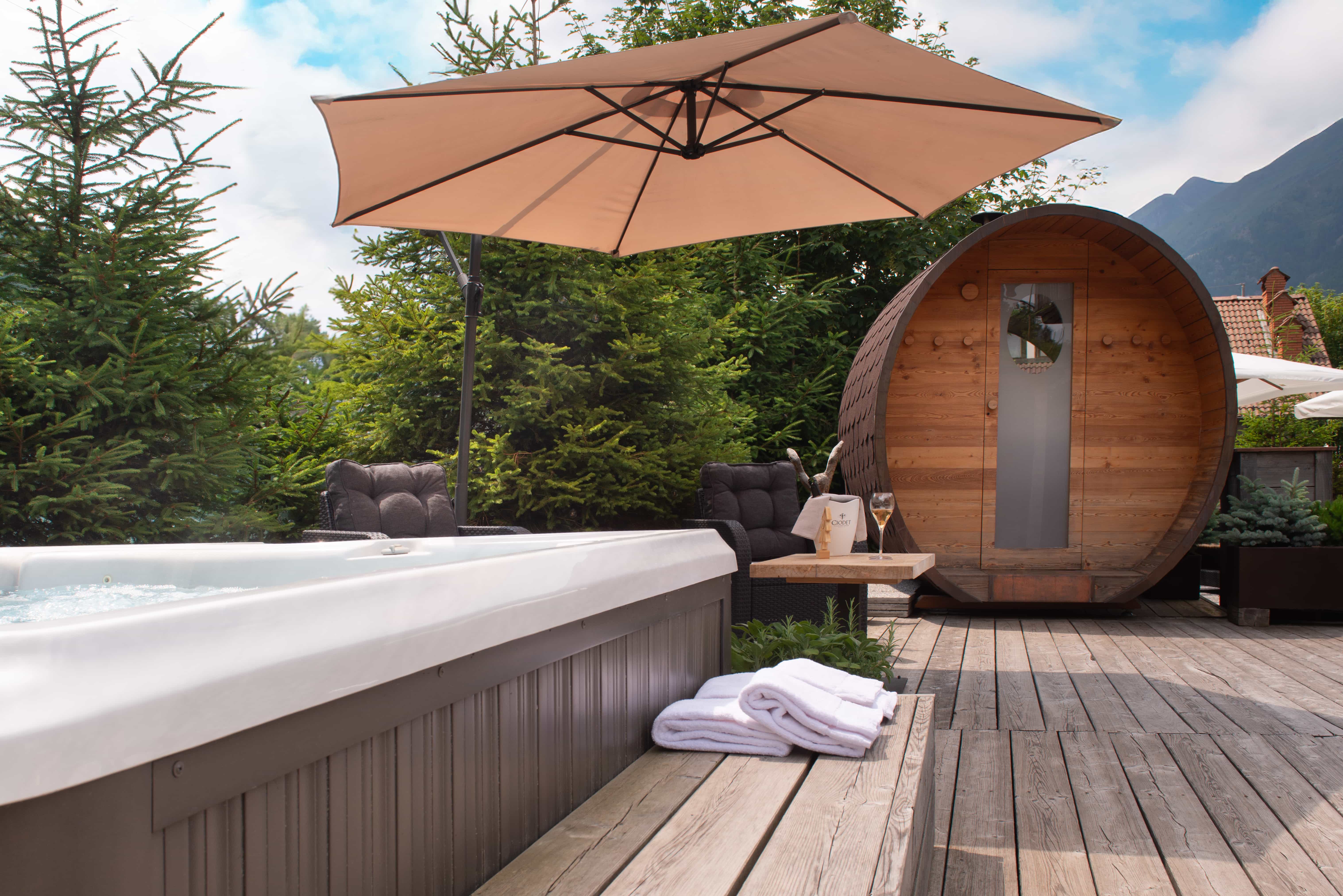 Area wellness all’aperto: sauna in cirmolo riscaldata a legna; vasca idromassaggio tutto l’anno a 35 gradi per rilassarsi al cospetto di una nevicata invernale o sotto una stellata estiva. Uno spazio silenzioso ed un solarium, aperto solo agli ospiti dell’hotel, affacciato sulle montagne. Il potere dell’acqua, dell’aria buona e lo scorrere del fiume in lontananza per ritrovare il proprio equilibrio.