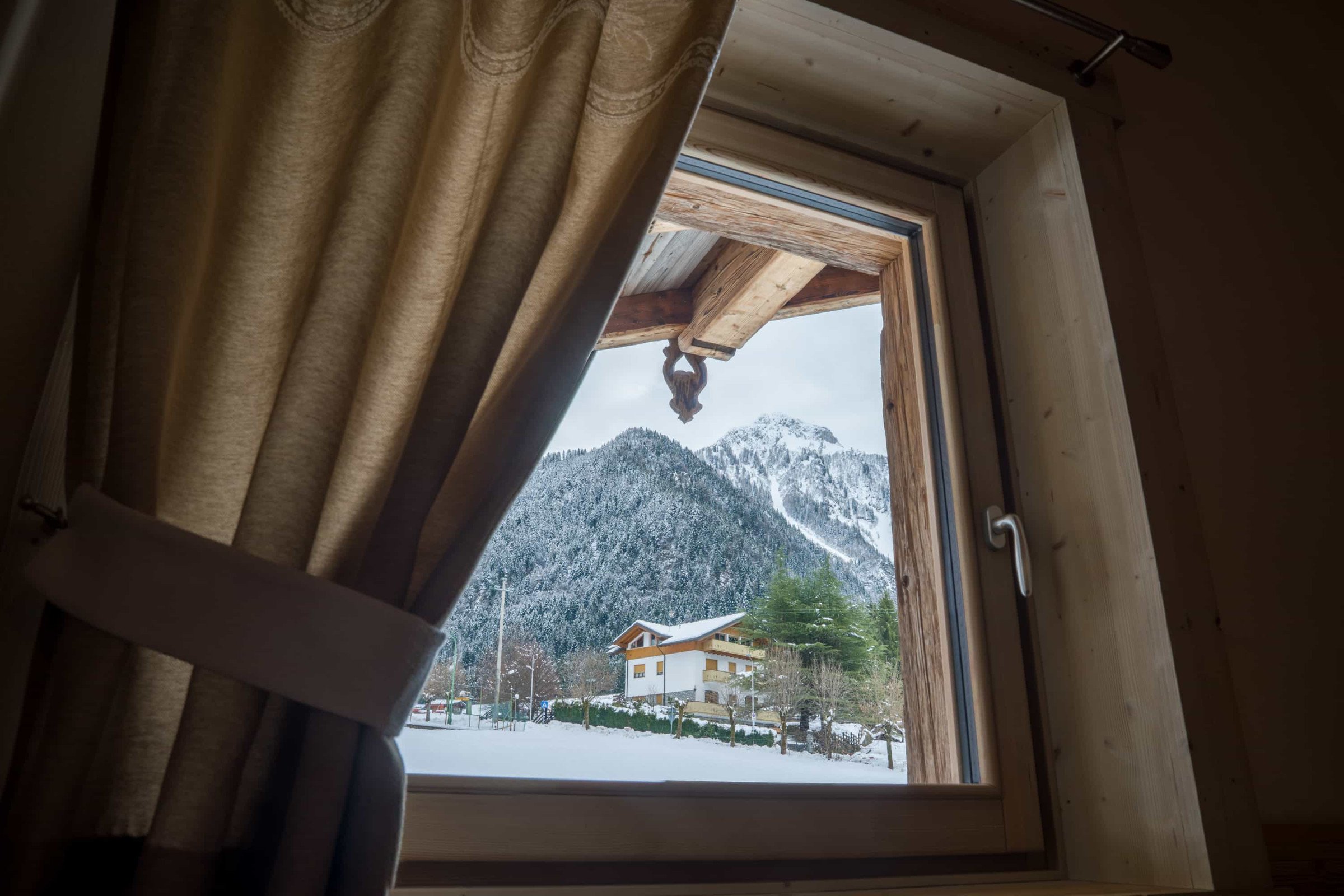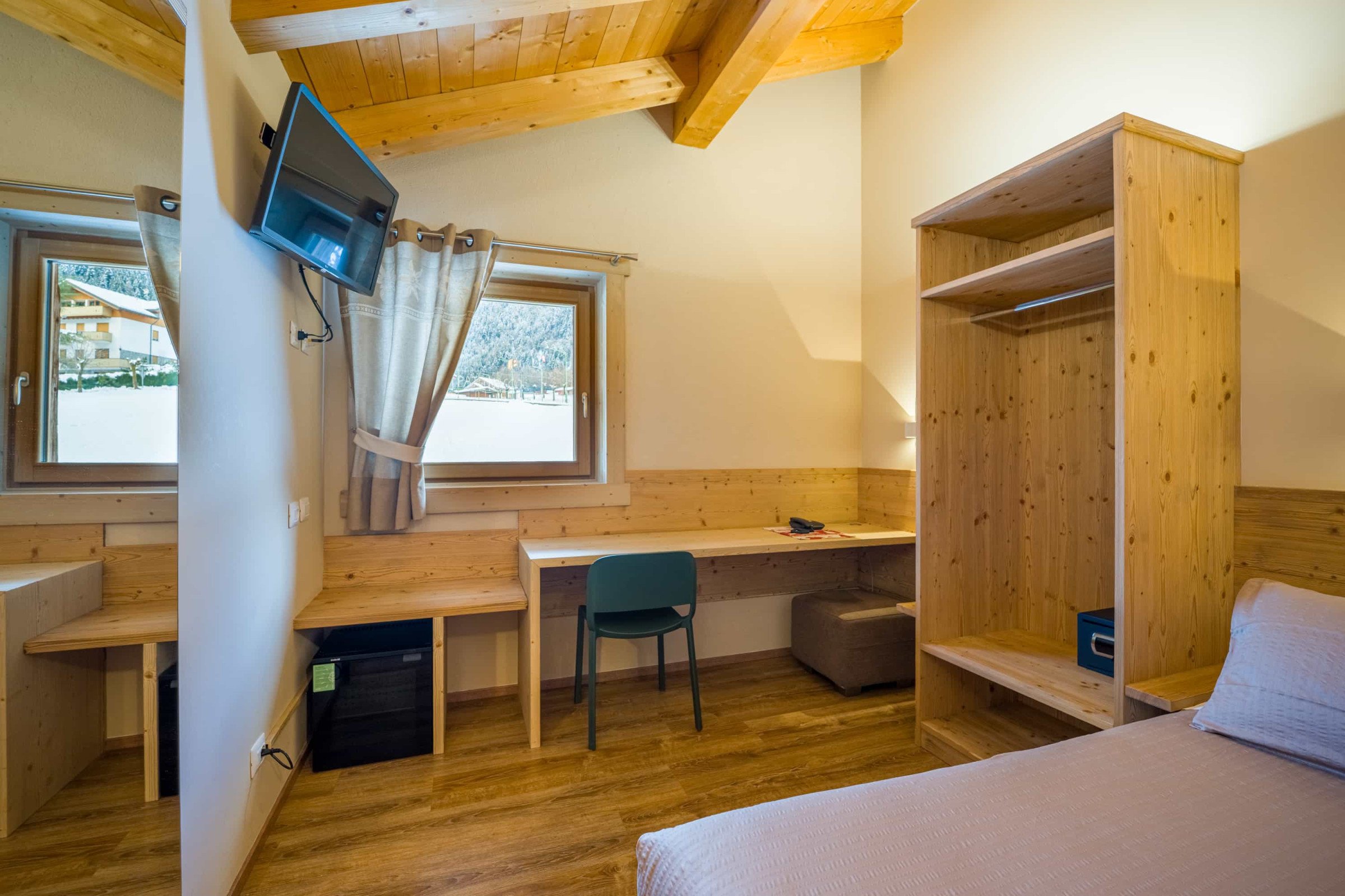 Camera con letto singolo, ampia scrivania e bagno, dotata di finestre vista montagne.