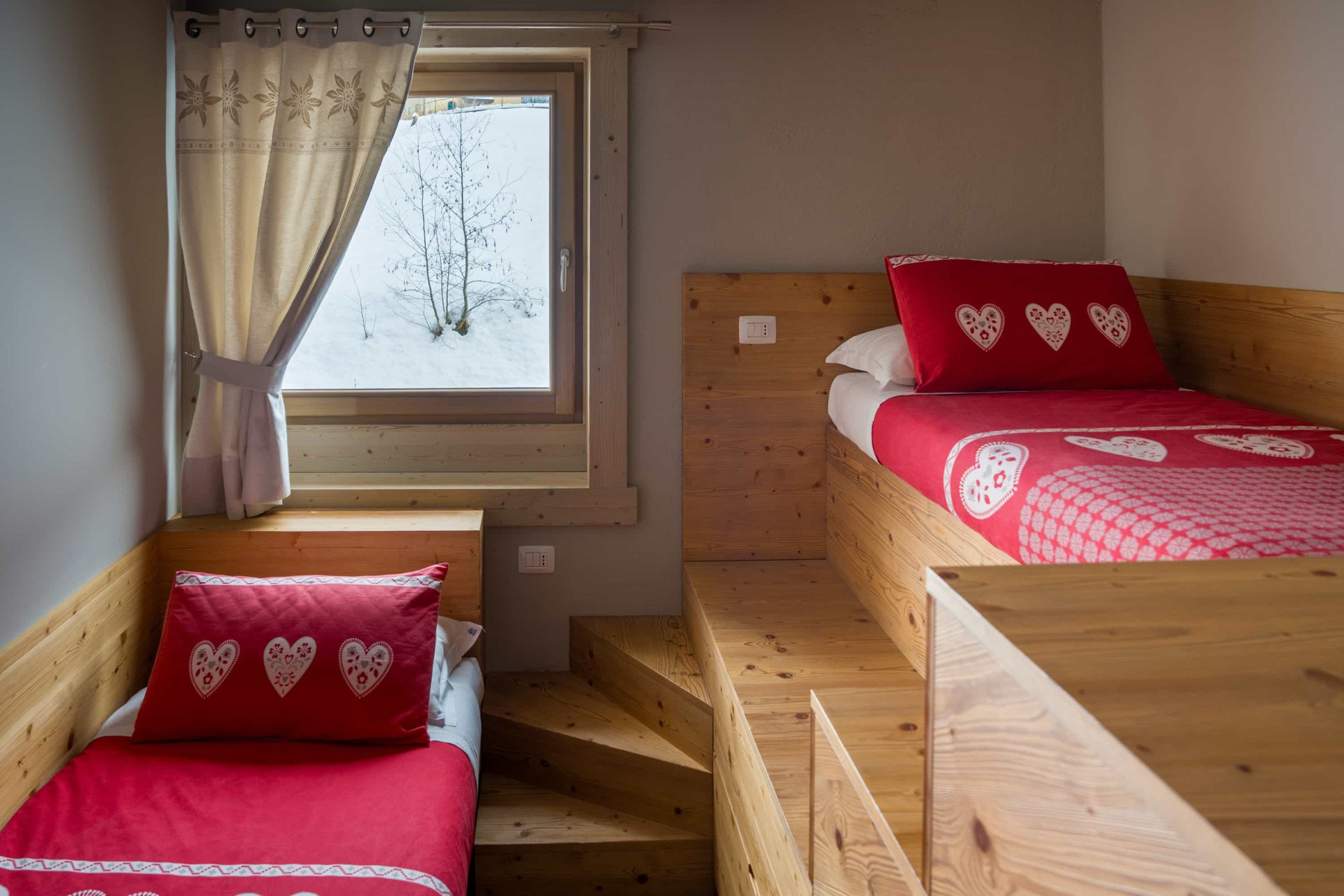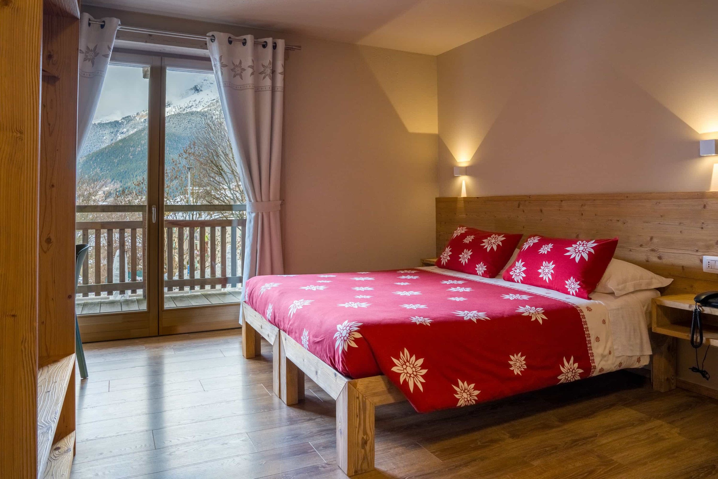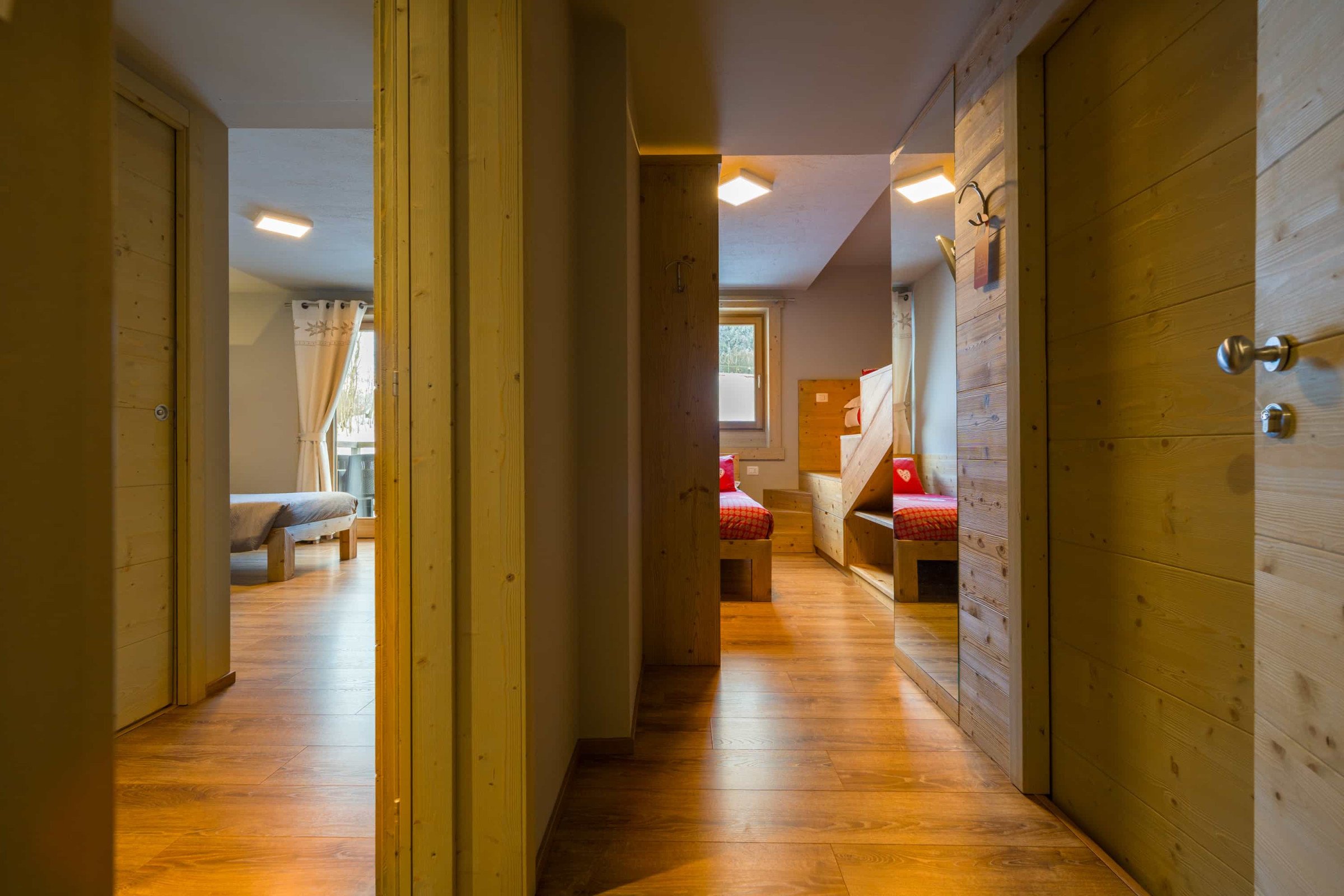 Camera composta da due stanze, ognuna con il proprio bagno. Una camera con letto matrimoniale e una seconda camera comunicante dotata di due letti singoli. Soggiornando in questa camera godrete di un ampio balcone con vista panoramica sulle nostre montagne. Arredo in legno ed un'atmosfera di relax e tranquillità.