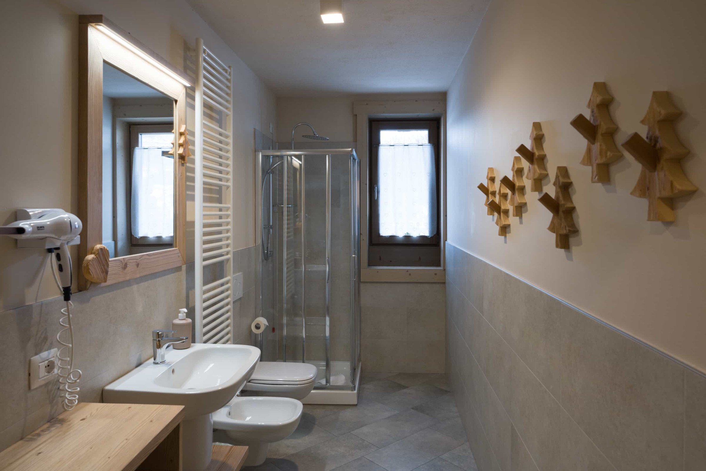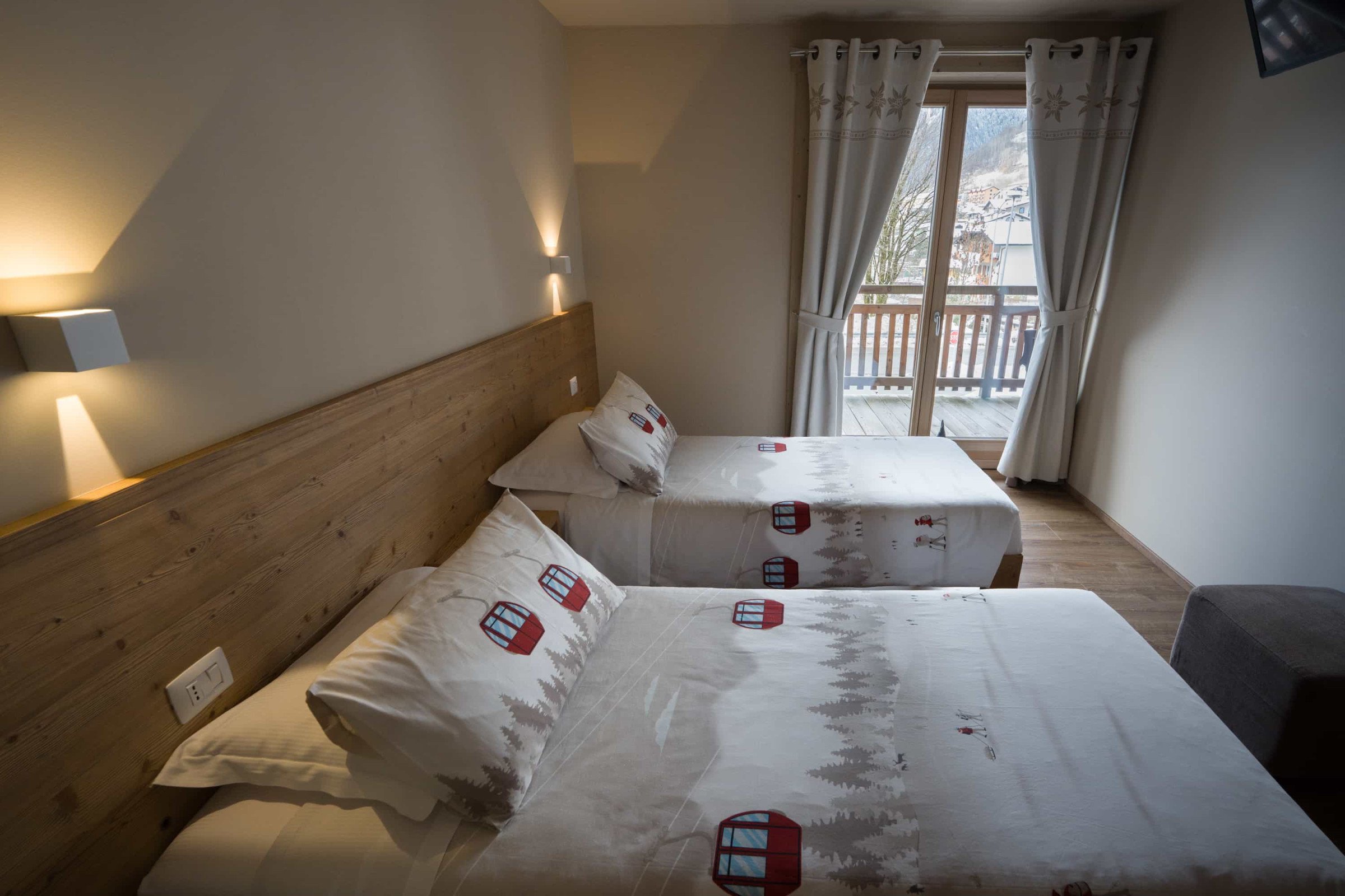 Soggiornando in questa camera godrete di una grande porta finestra e di un balcone arredato che si affacciano sulle nostre montagne. Ad accompagnare la vista panoramica, un caldo stile montano ed un'atmosfera di relax e tranquillità.